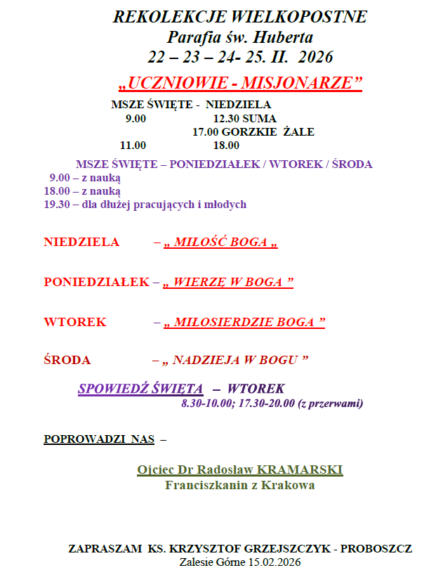 - W najbliższą środę - ŚRODA POPIELCOWA - którą rozpoczynamy WIELKI POST. Podejmiemy w nim - jak zwykle drogę nawrócenia i pokuty przez Nabożeństwa DROGI KRZYŻOWEJ oraz GORZKICH ŻALI..